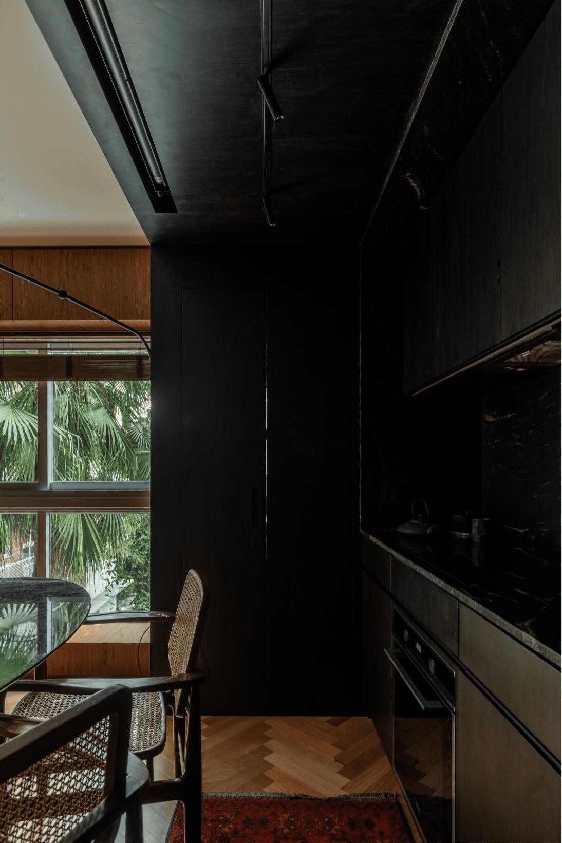 O programa original, com dois quartos e dois banheiros, sendo um deles suíte, deu lugar a uma configuração mais fluida: agora, o apartamento abriga uma suíte, uma confortável sala de estar, ampliada a partir da supressão do segundo dormitório. O lavabo reposiciona usos e circulações, enquanto a sala dialoga com a cozinha através de uma caixa preta em lâmina de madeira ebanizada, onde todos os armários se ocultam — inclusive a cuba, de louça preta, reforçando a unidade cromática do espaço. A área de serviços é resolvida em menos de 1m², camuflada atrás de uma porta camarão. Ali, lavadora, tanque, janela e varal atestam o bom aproveitamento dos pequenos espaços.