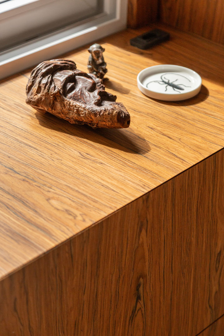 Os materiais, mais do que revestimentos, desenham a paisagem da casa: o piso de madeira se estende pela sala, suíte e cozinha, e contrasta com a pedra natural nos banhos e área de serviços. A marcenaria executada em lâmina pau-ferro acompanha toda a extensão da parede externa do apartamento, conectando sala e suíte em um único gesto horizontal. Este móvel se estende de ponta a ponta, integrando os ambientes e reforçando a continuidade espacial. Portas e gavetas, com fechamento em ângulo de 45° e ausência de puxadores aparentes, mantêm o desenho limpo e funcional. Persianas em madeira, escolhidas na mesma tonalidade, complementam o conjunto e estabelecem o ritmo dos vãos ao longo da fachada.