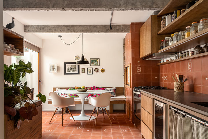 Na sala de estar, o porcelanato deu lugar a tacos de madeira natural, que aqueceram o ambiente. Já na cozinha e copa, o ladrilho hidráulico, em tons terracota, agregaram cor e identidade. Também mantivemos boa parte dos móveis existentes, porém em novo layout.